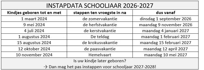 Niet gunstig gerangschikte kinderen komen op een wachtlijst te staan. Indien jullie hierover nog vragen hebben, neem dan gerust contact op met de school. Vrije inschrijvingen starten op 21/05/2026 (3de voorrangsperiode)